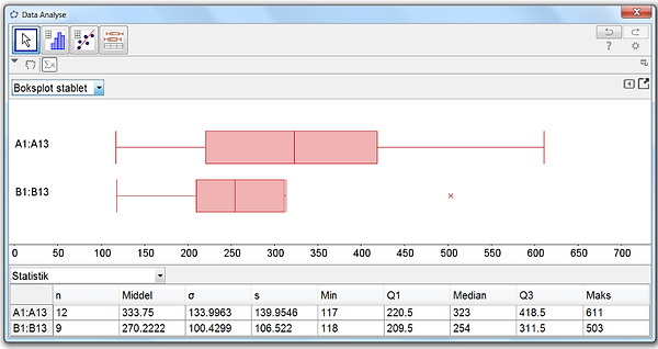 GeoGebra viser de to boksplot stablet.